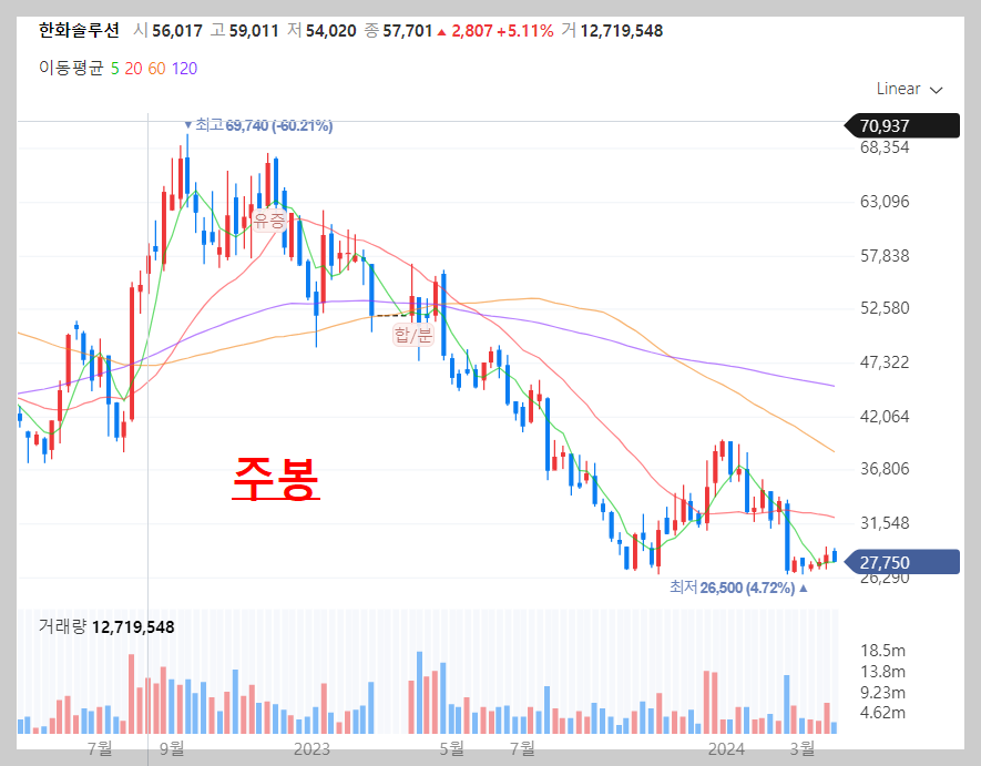 대한민국 사람이라면 한화솔루션을 모를 수 없을 정도로 큰 대기업입니다. 현재 코스피 81위를 달리고 있으며 현재에는 주춤하는 경향이 있지만 시총 4조에 육박하는 시가총액을 유지하고 있습니다.