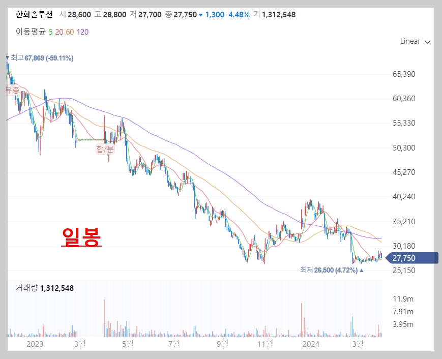 주식을 차트만으로 판단하기는 힘들지만 개인적으로는 차트를 더 믿고 생각하는 1인으로서 이번 한화솔루션 매수 포지션은 나쁘지 않다고 생각합니다. 아시는 분들은 이미 다 아시겠지만 이미 저점을 두 번이나 잡고 가고 있으며 대부분의 이러한 차트봉에서는 피지컬한 상승이 나오는 경우가 많습니다.