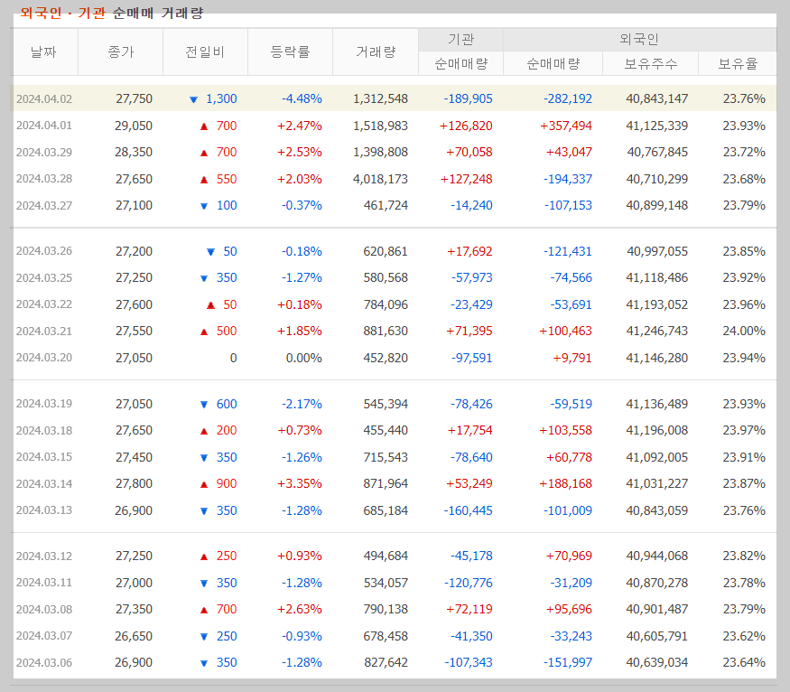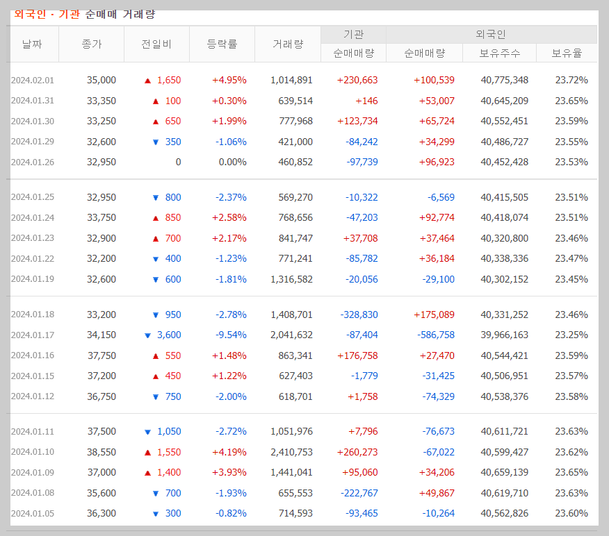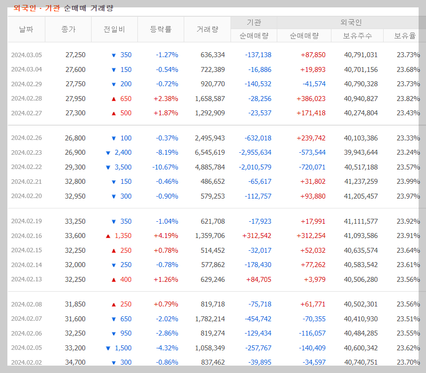여기서 주목해야 할 점은 거래량보다는 외국인의 보유율이라고 생각합니다. 실제로 외국인과 기관의 꾸준한 관심을 가지고 있는 종목이기도 한 한화솔루션은 외국인 보유율은 거의 변동이 없습니다. 물론 사고팔고 가 많지만 그래도 비율은 변동이 없습니다.