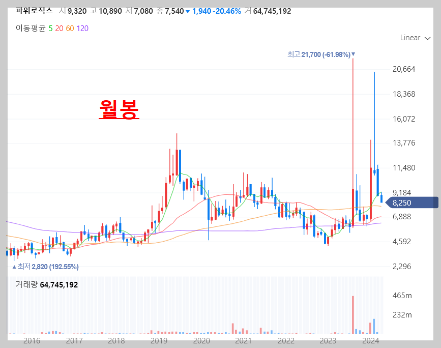 위에 파워로직스 주가 거래량을 보셨으면 아시겠지만 차트로만 봐도 이미 전 저점을 몇 번이나 뚫고 내려가고 있습니다. 이제는 120선이나 60선을 뚫고 가고 있어서 솔직히 언제까지 내려갈지 이제는 모를 상황입니다. 조금 더 속상한 것은 일봉뿐만 아니라 주봉에서도 하락이 보인다는 점입니다.