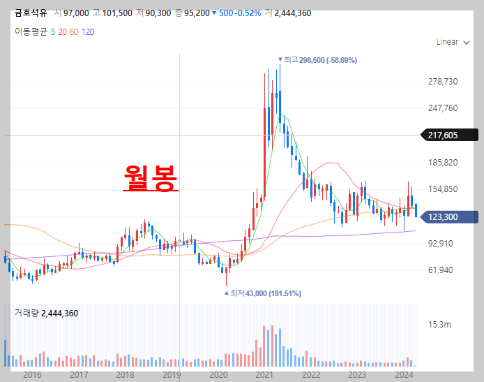 금호석유는 예전부터 알았으며 사기도 팔기도 했던 기업입니다. 하지만 한동안 안 보다가 여러 차트들을 구경하다 힘차게 흐르고 있는 기업을 봤더니 금호석유 주가였습니다. (어찌 보면 지금이 타이밍을 잡을 수 있는 기회?)